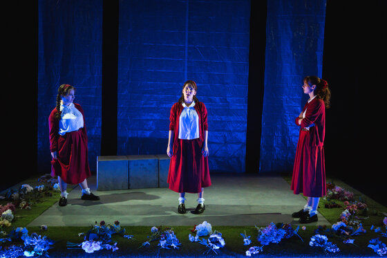 As the action takes place between the three girls in school uniform on stage, projection after projection is displayed with the derogatory remarks of incels.