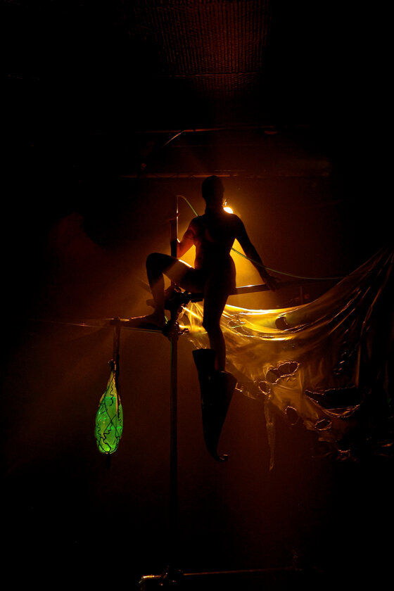 The naked, masked figure with a black spike pointing backwards on one leg, climbs slowly and methodically over, under and between the “apparatus”.